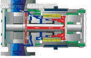 ” 并沒(méi)有直接將入口和出口短接。足夠的冷卻液體的產(chǎn)生與進(jìn)出口壓差,粘度和軸轉(zhuǎn)速無(wú)關(guān)。而且,這種系統(tǒng)有一個(gè)更重要的獨(dú)特的優(yōu)點(diǎn),那就是該制造商 ROTAN 的磁力驅(qū)動(dòng)齒輪泵可以正反轉(zhuǎn)而不影響它冷卻系統(tǒng)的工作。因?yàn)檗D(zhuǎn)向相反,系統(tǒng)中的液體流向也只是簡(jiǎn)單的方向相反而已。